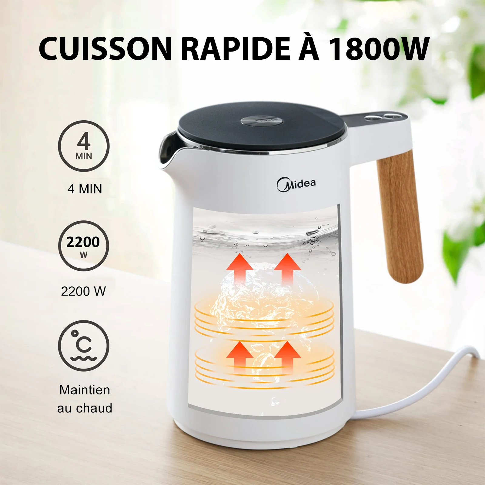 • Boil 2200 W water fast: thanks to the use of the latest water circulation heating technology, the Midea kettle with variable temperature can heat the water particularly quickly and quietly. It only takes 4-5 minutes to boil 1.5 litres of water. No more long waiting. Enjoy fresh tea or aromatic coffee in no time.