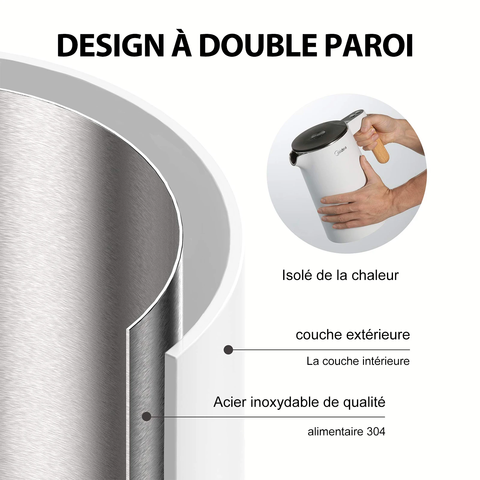1.5 L, Double Wall 2200 W, 45-100 °C, Stainless Steel Kettle with Temperature Display, Coated Wooden Handle, Hot for 60 Mins, White