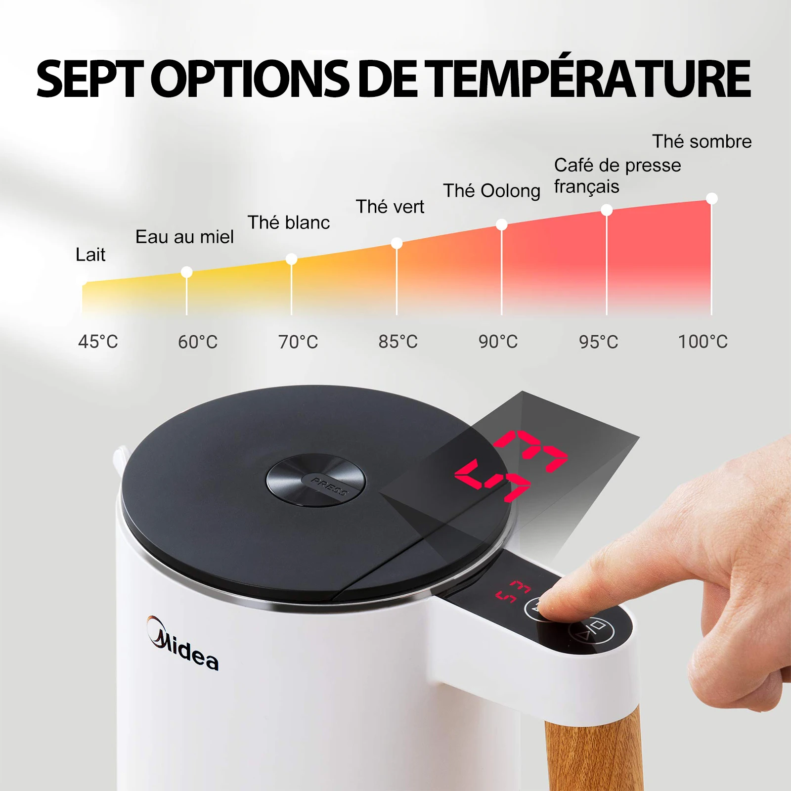 • Precise temperature control: 7 different heat settings are preset for brewing tea or coffee with just the right temperature. Midea kettle provides precise temperature control (45°C – 100°C) to get the best, tastiest teas, coffee, milk or simply boil water.